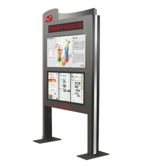 高端户外电子阅报栏灯箱是平面媒体二次传播的载体,为广大群众增加了学习党的方针政策的机会和了解各类信息的渠道。是党和政府重要的舆论宣传阵地,有利于促进当地经济发展和精神文明建设。同时也是党和政府扩大和占领新的舆论阵地的重要举措。