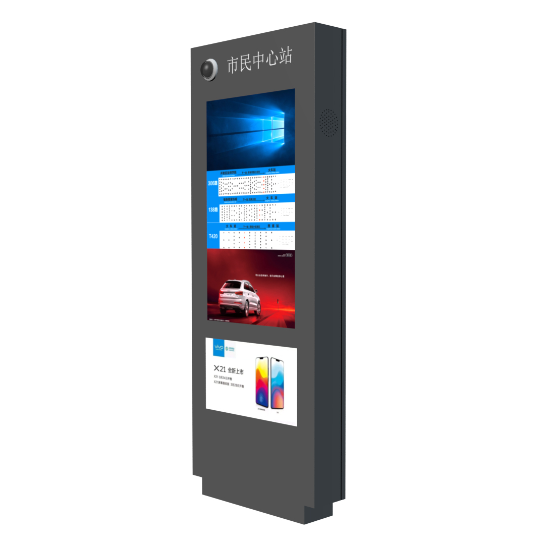 公交电子站牌户外高亮:工业级户外液晶显示屏,亮度达到1500-2500流明,强光下可视;